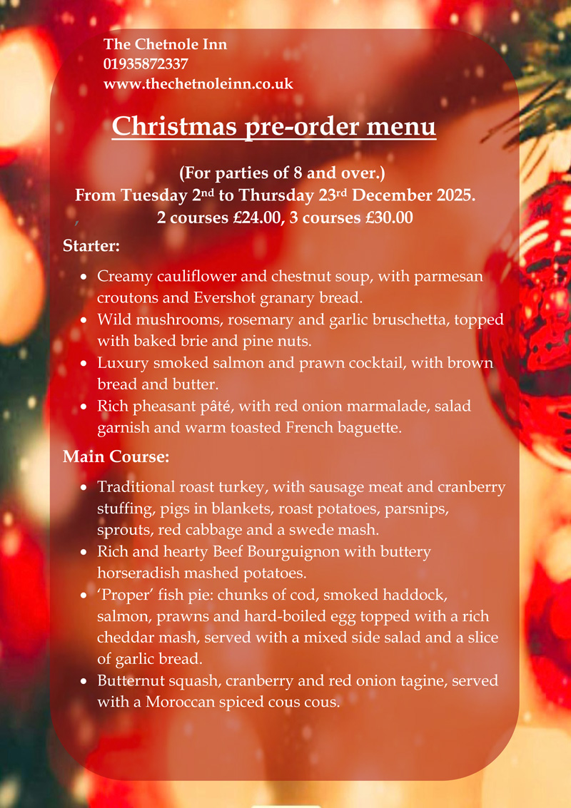 Christmas Menu 2025 - The Chetnole Inn - Pub Restaurant Bed & Breakfast. Tucked away in the beautiful Dorset countryside, close to Sherborne lies the Chetnole Inn. It is the perfect base to discover picturesque Dorset, Dorchester